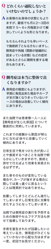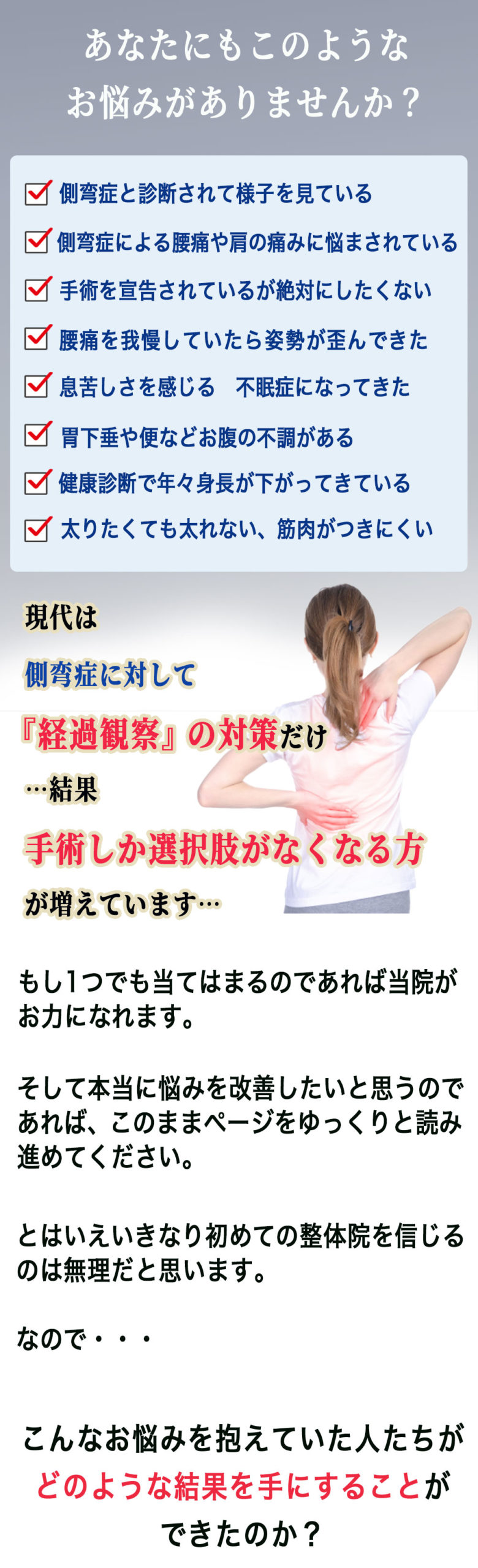 30代女性 腰痛を庇っていたことにより側弯症になってしまう 痛みによって側弯症が強くなることが怖かったが現在は進行することなく維持できている